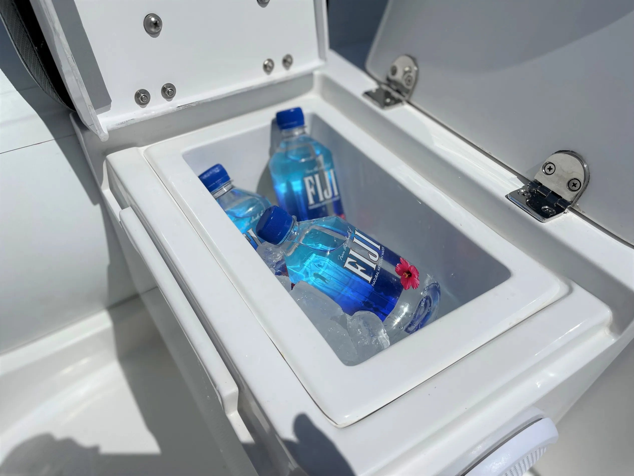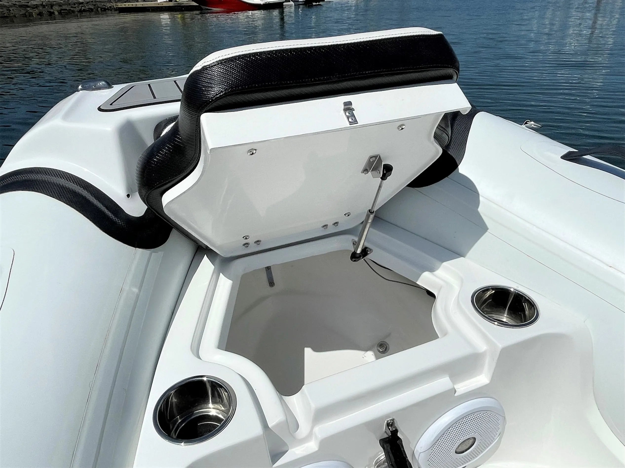For snorkelling and diving you have a more open deck layout with the pedestal console base, there is also a telescoping flip down ladder in the transom for reboarding and an optional fresh water shower. For fishing, there is an option of 4 flush mounted stainless steel rod holders mounted behind the driver seat. For tow and board sports you can use the rod holders for a board rack, and there is an optional heavy duty telescoping ski pole.