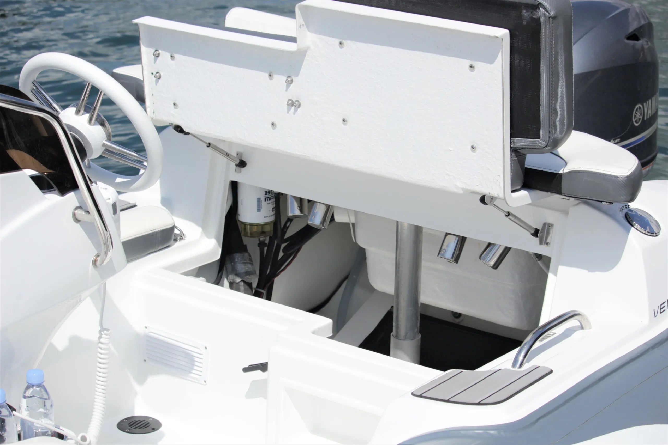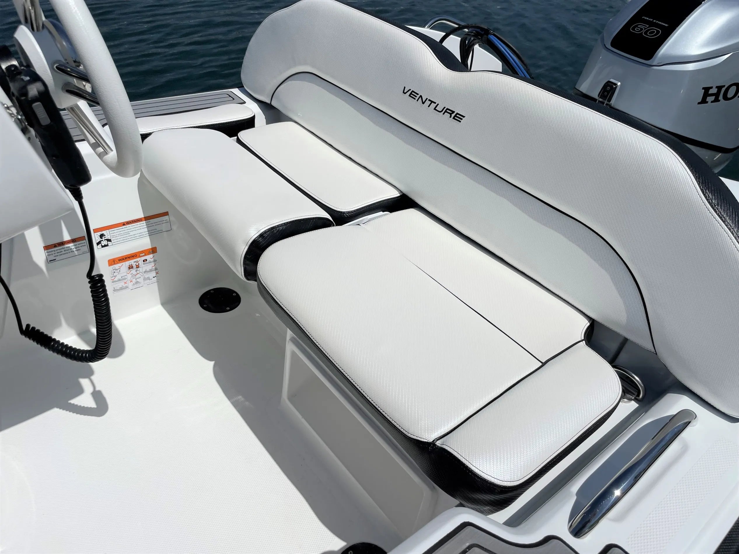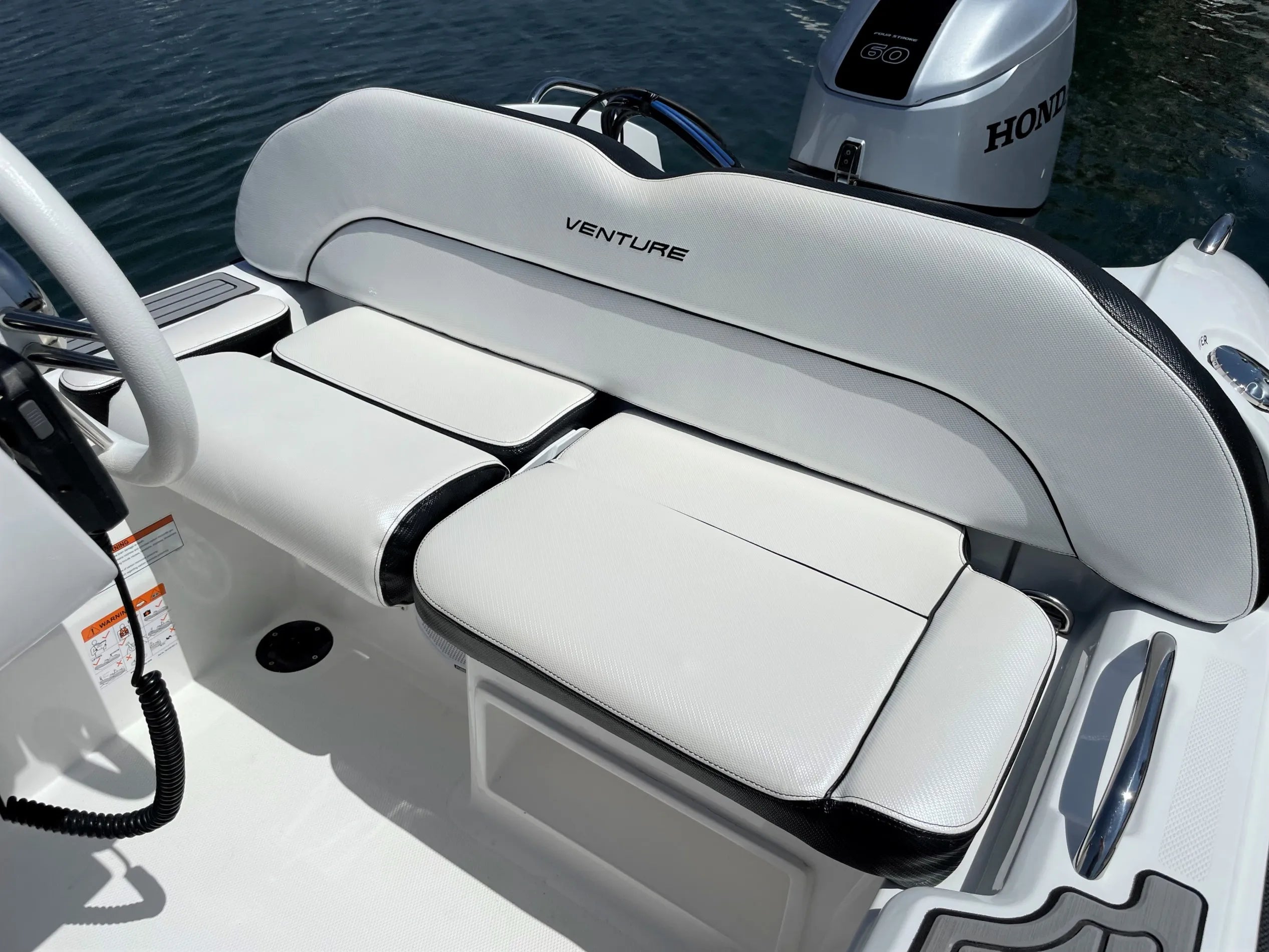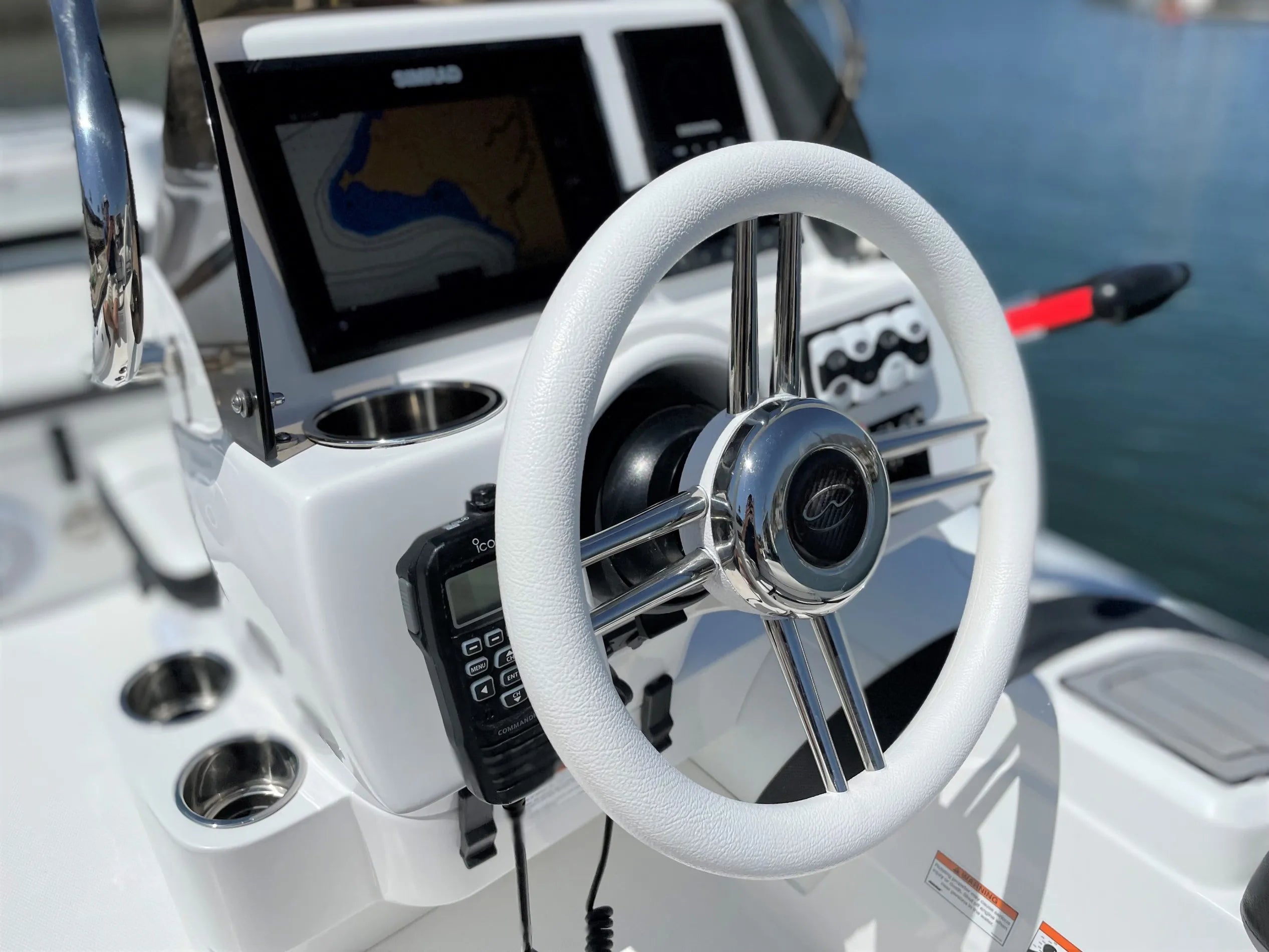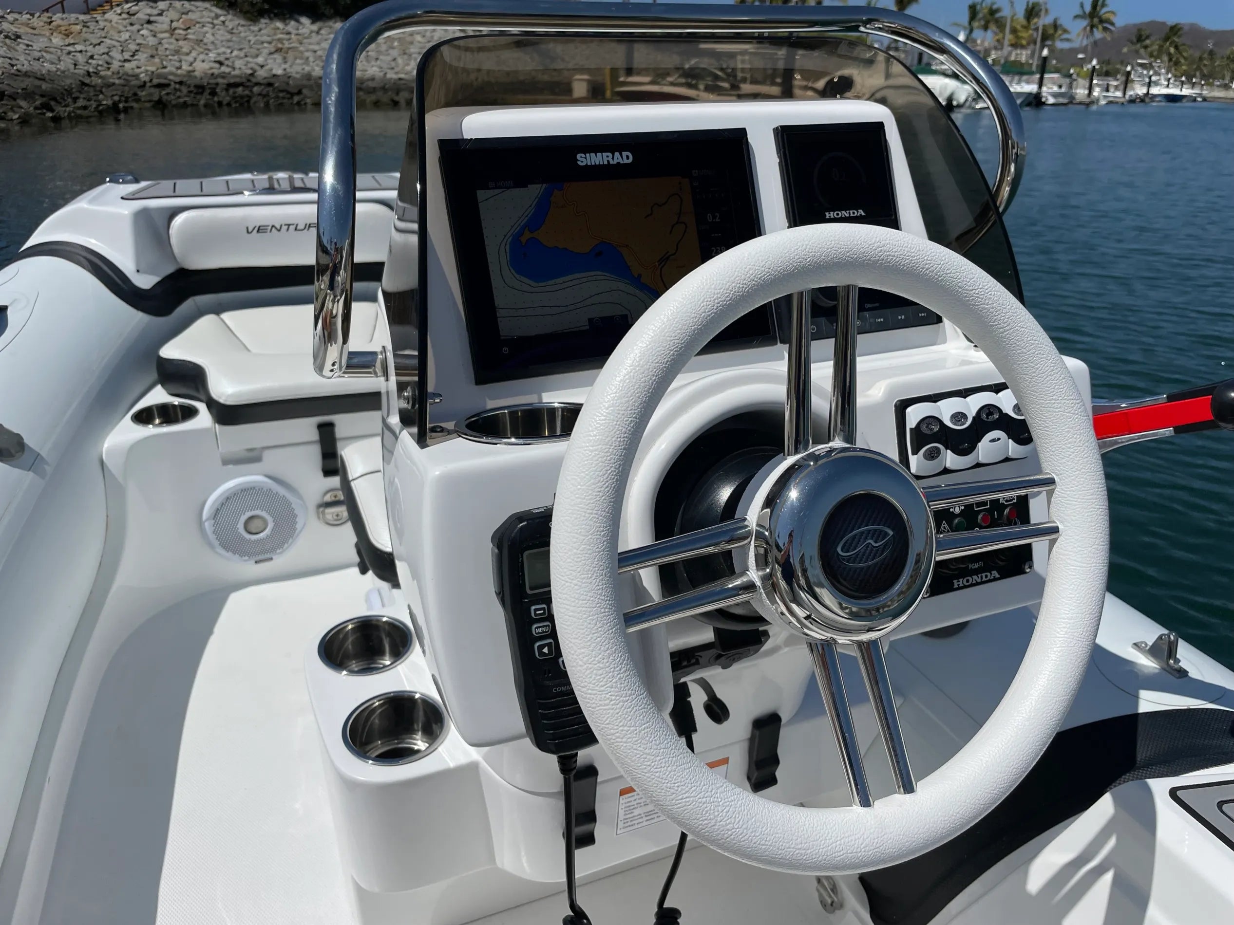 - Console dash accommodates a 9″ chartplotter, gauges, stereo and handheld VHF.