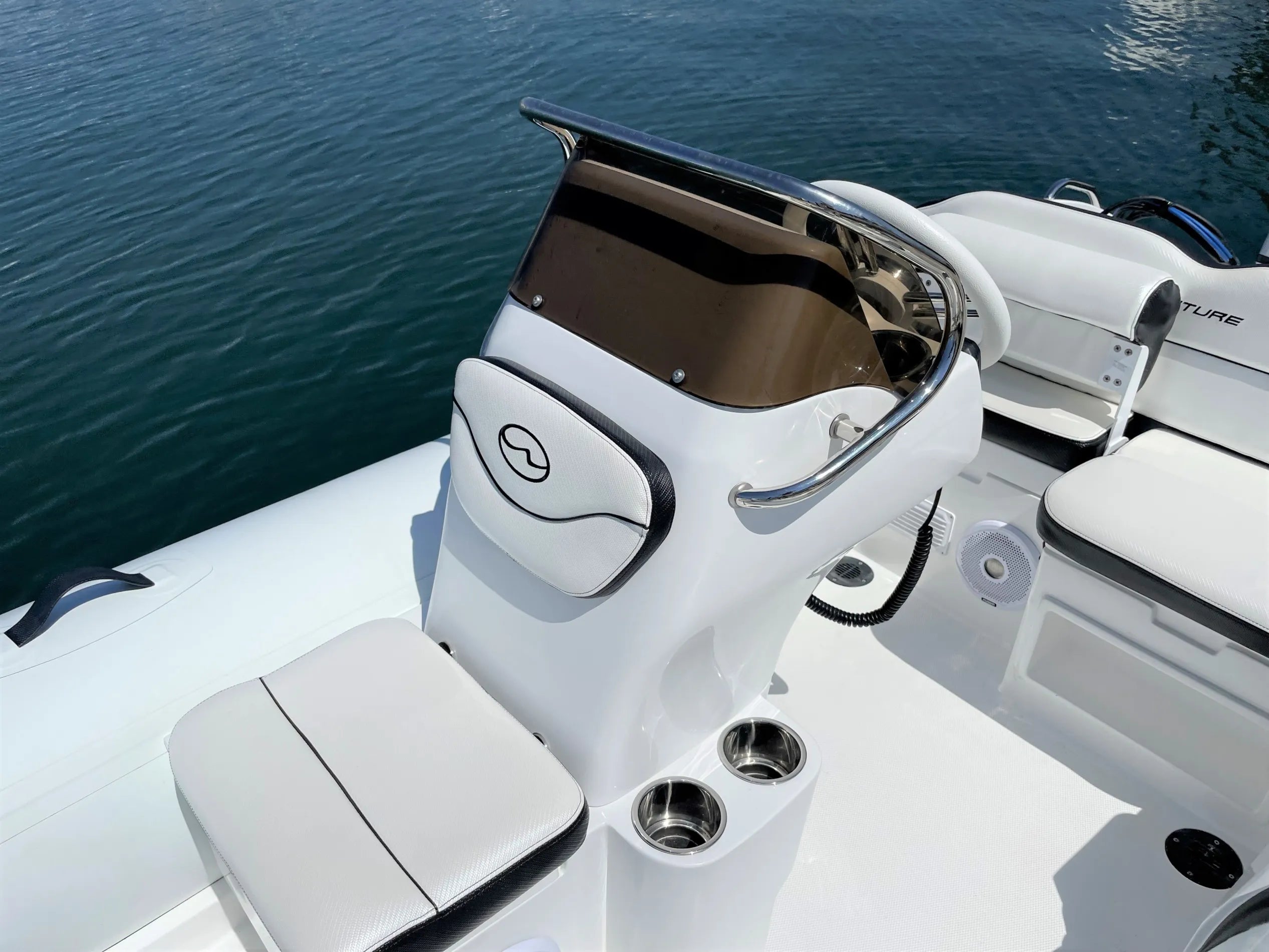 - Console dash accommodates a 9″ chartplotter, gauges, stereo and handheld VHF.