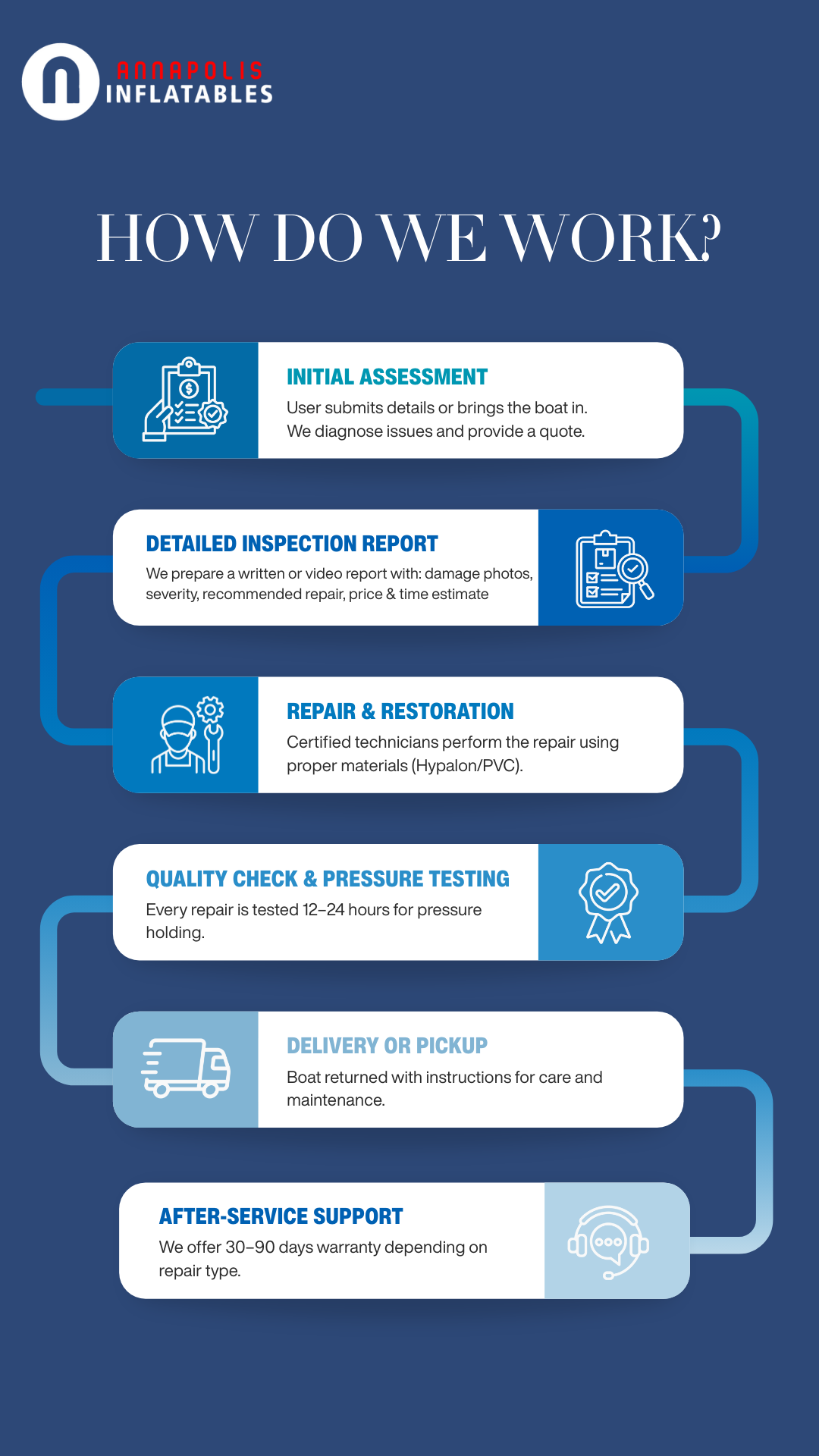 Your inflatable boat is built for adventure, not slow leaks, weak seams, or hidden damage. At Annapolis Inflatables, we provide professional inflatable boat repair and maintenance services to keep your boat safe, reliable, and ready for the water.