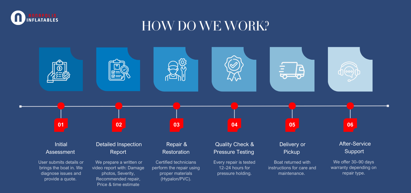 From small pinhole leaks to full tube restoration, our certified technicians handle PVC, Hypalon, and Neoprene inflatables with precision and marine-grade materials.