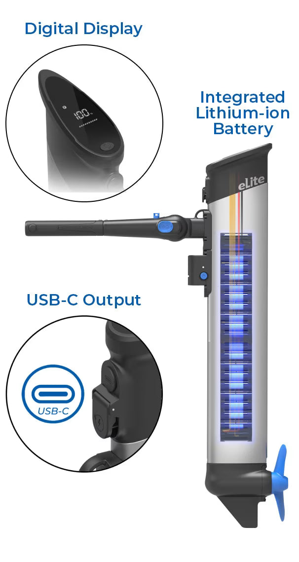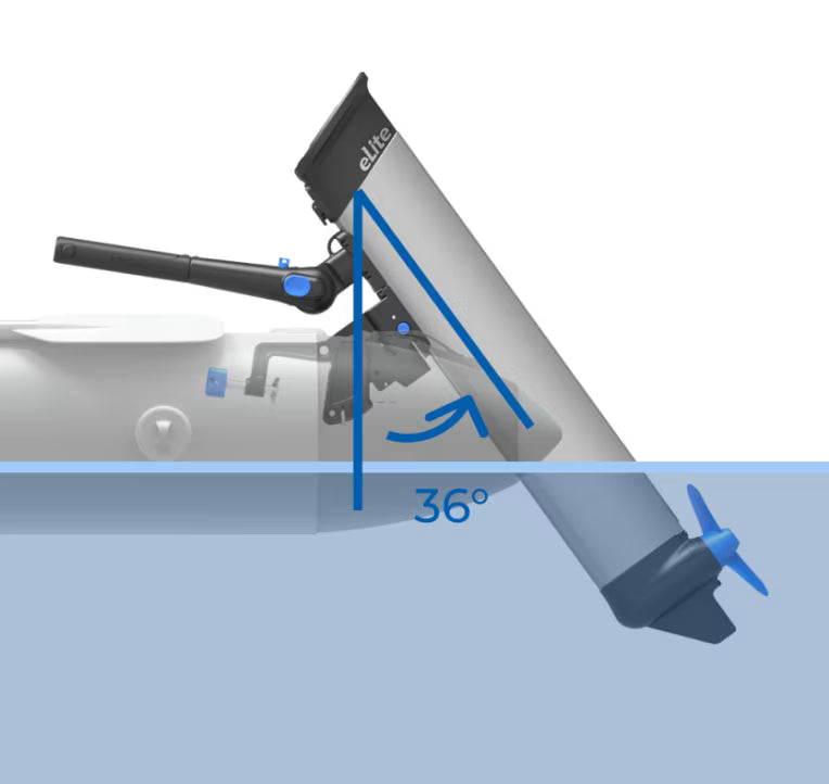 The eLite includes a shallow-water mode with a 36° tilt angle and an automatic kick-up function to help protect the motor if it bumps into the bottom. With ±70° steering and multiple trim positions, it stays adaptable in varying water depths.